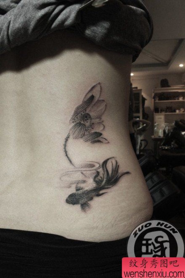 美女腰部时尚时尚的水墨莲花与鲤鱼纹身图案