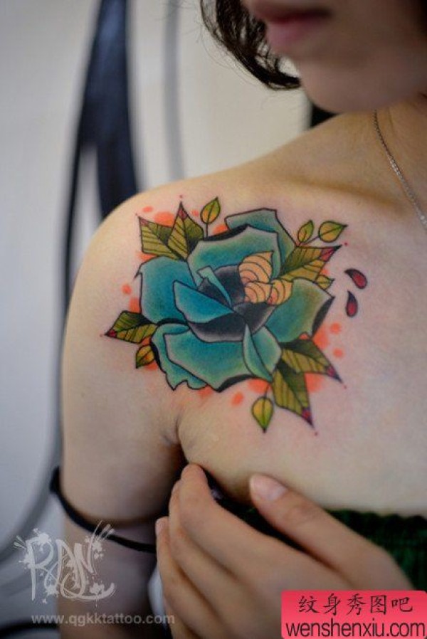 女生肩膀处漂亮时尚的玫瑰花纹身图案