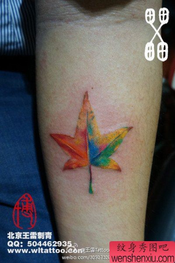 手臂漂亮的彩色枫叶纹身图案