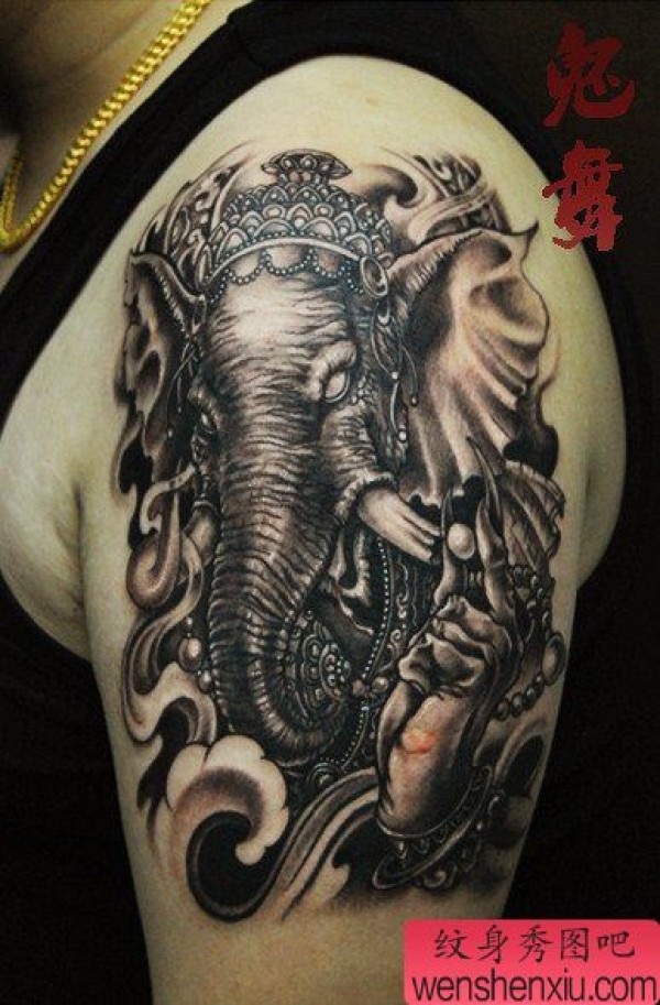 男士手臂超帅经典的黑灰象神纹身图案