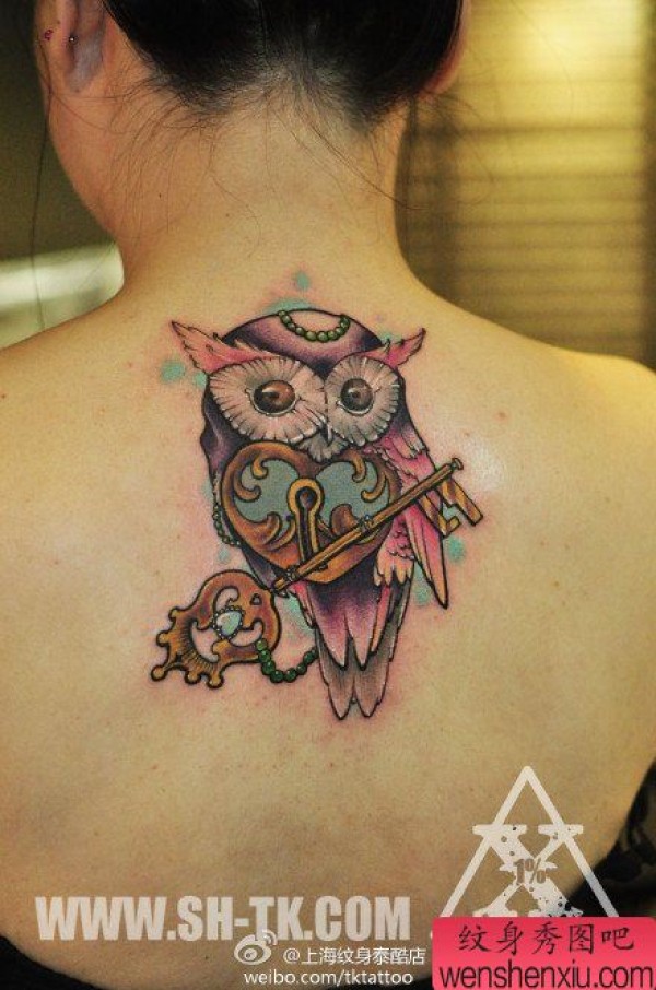 后背时尚经典的猫头鹰锁与钥匙纹身图案