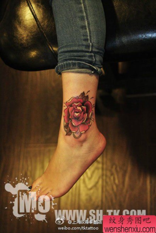 女生脚踝时尚时尚的玫瑰花纹身图案