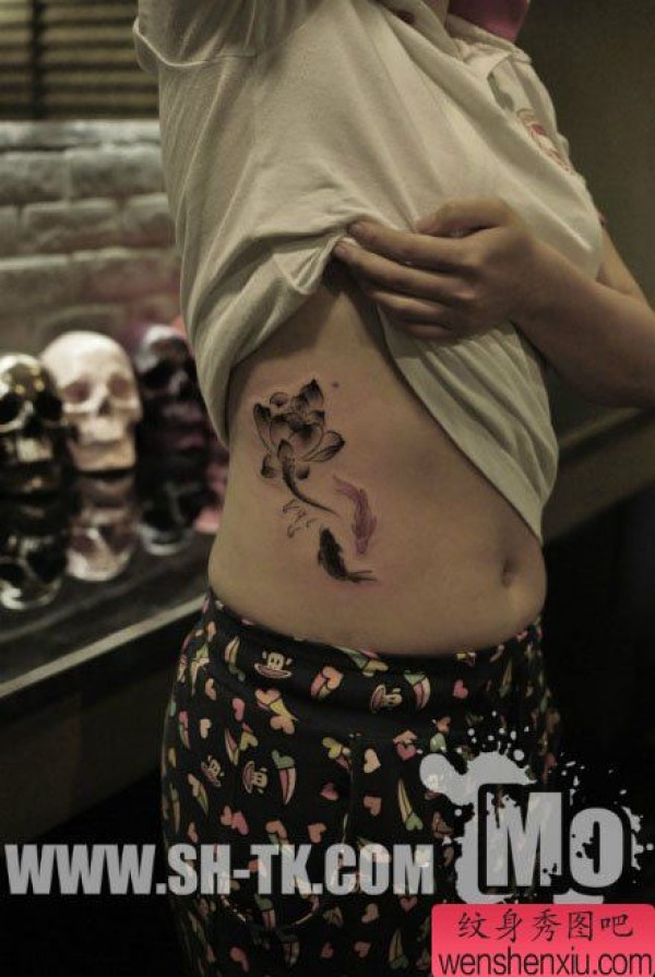 美女侧腰时尚唯美的水墨莲花鲤鱼纹身图案