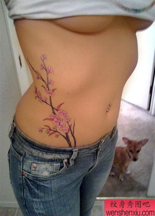 美女腹部时尚漂亮的桃花纹身图案