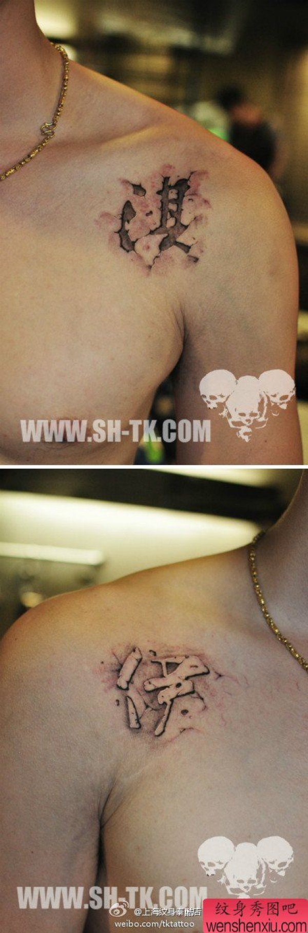肩膀处石雕烙印与浮雕汉字纹身图案