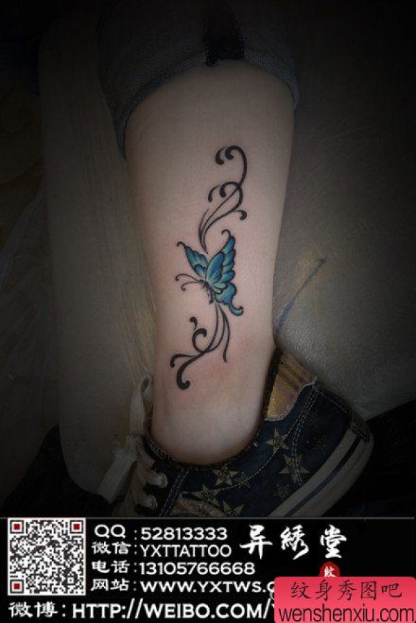 女生喜欢的腿部蝴蝶藤蔓纹身图案