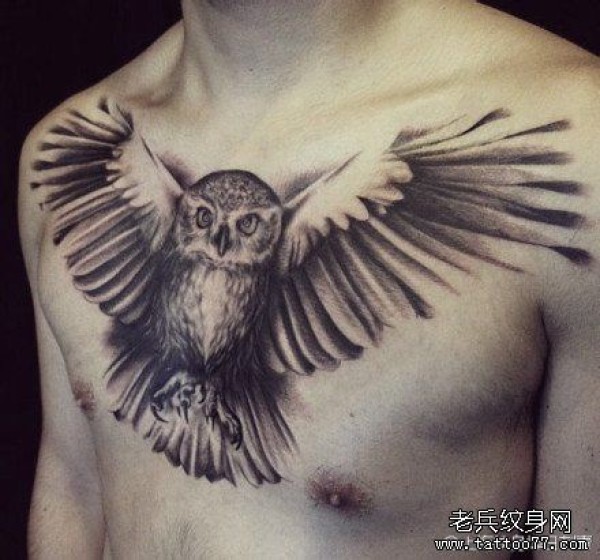 男士前胸超酷经典的黑白猫头鹰纹身图案