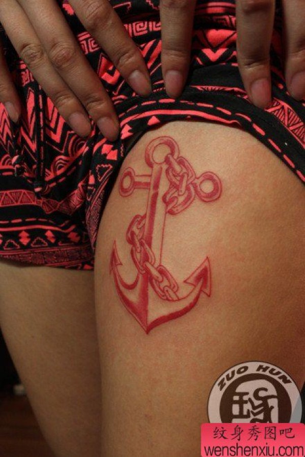 女生腿部唯美的彩色船锚纹身图案