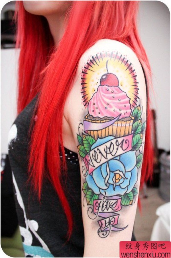 女生手臂时尚时尚的冰激凌与玫瑰花纹身图案