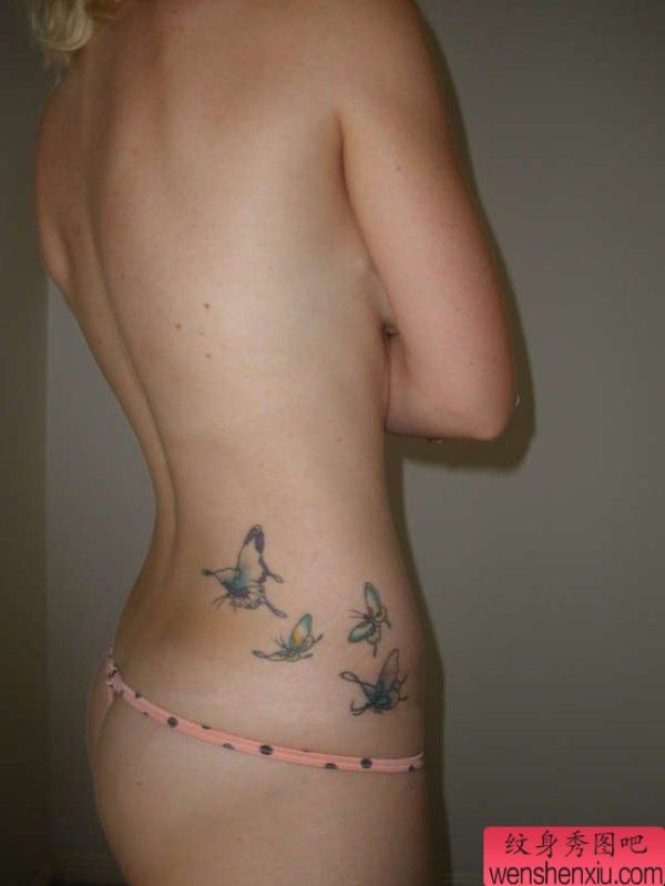 女生臀部唯美时尚的彩色蝴蝶纹身图案