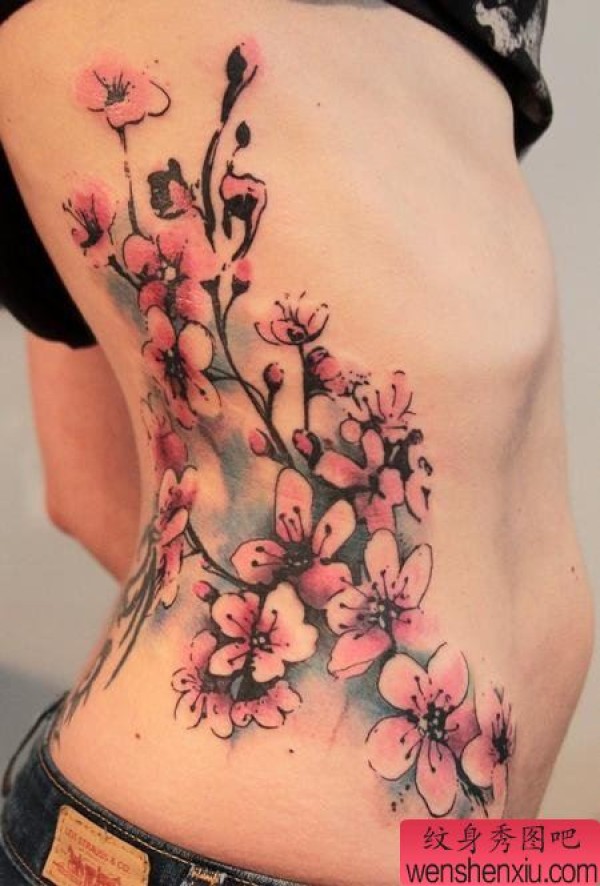 女生侧腰唯美时尚的彩色桃花纹身图案