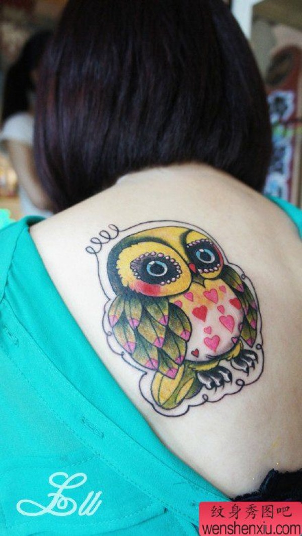 女生肩背可爱时尚的猫头鹰纹身图案