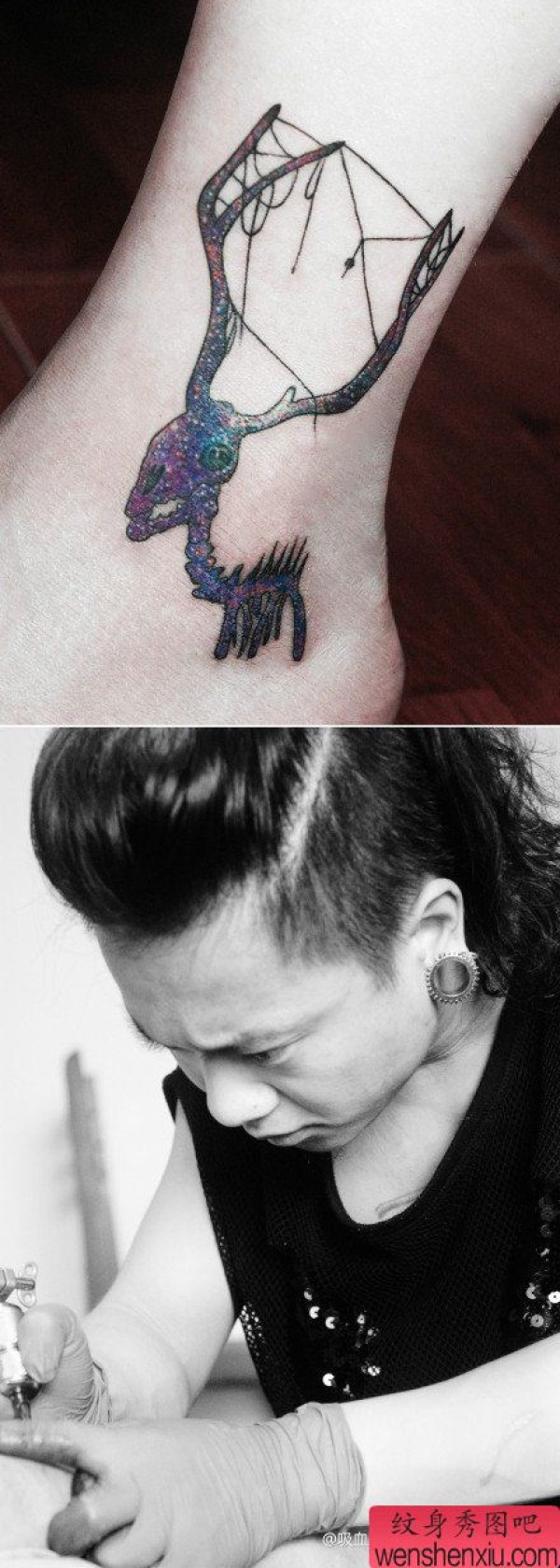 女生脚踝处经典的星空鹿纹身图案