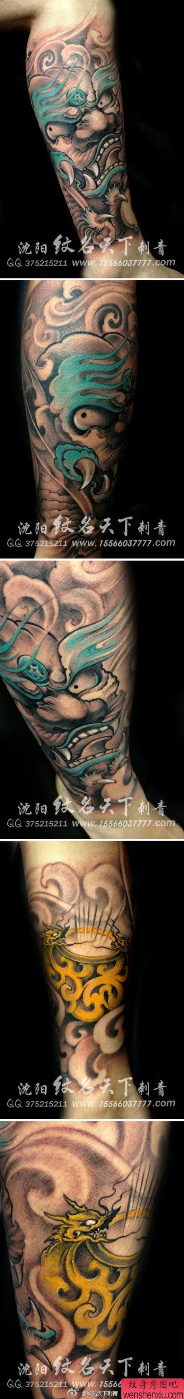 男士腿部经典很酷的唐狮子纹身图案