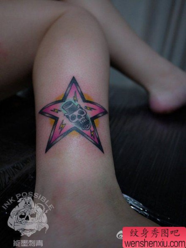 女生腿部精美漂亮的五角星与骷髅纹身图案