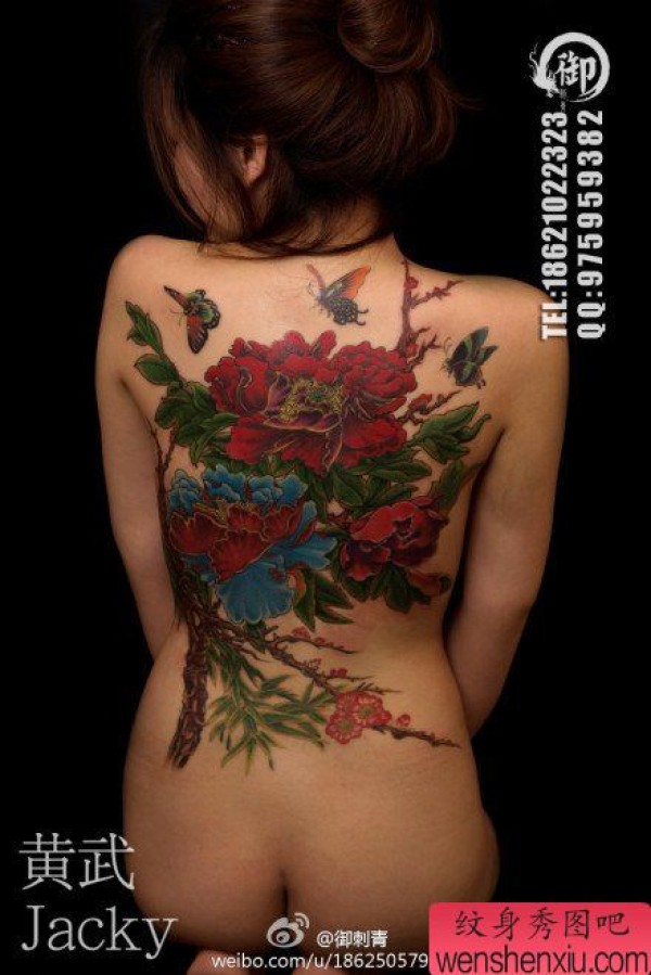 女生后背时尚精美的牡丹花纹身图案