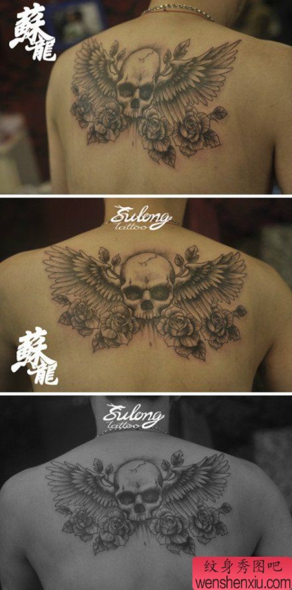 男生后背超酷经典的骷髅翅膀纹身图案