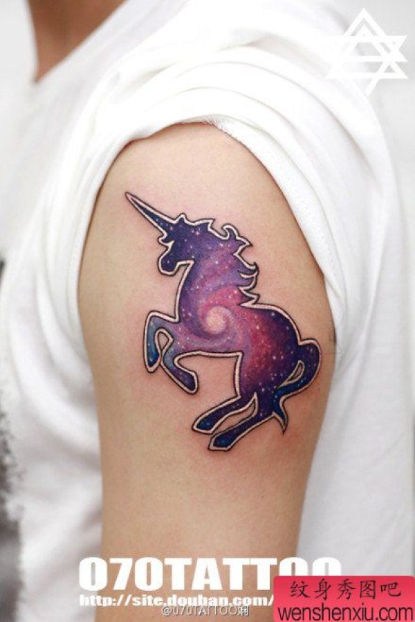 手臂漂亮精美的彩色星空独角兽纹身图案