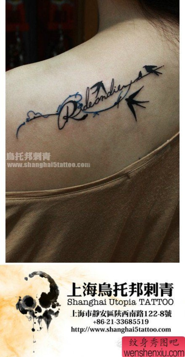 女生肩膀处时尚精美的字母与小燕子纹身图案