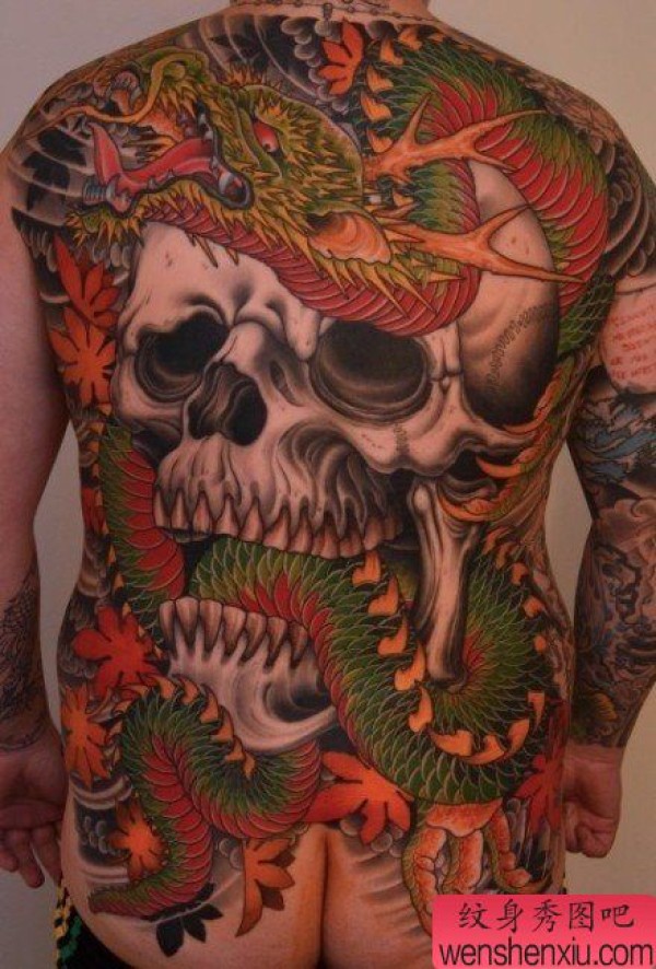 男士背部经典超酷的满背骷髅蛇纹身图案