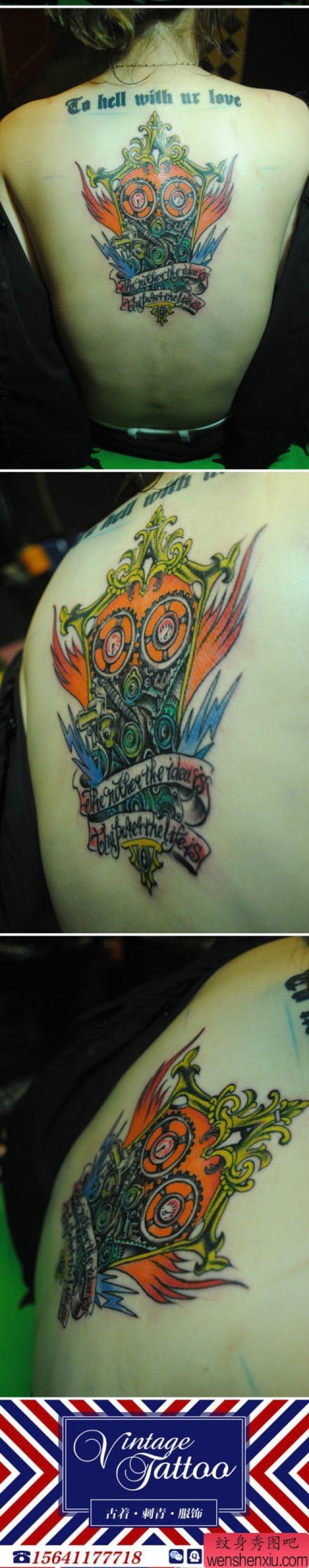 女生后背帅气时尚的机械猫头鹰纹身图案
