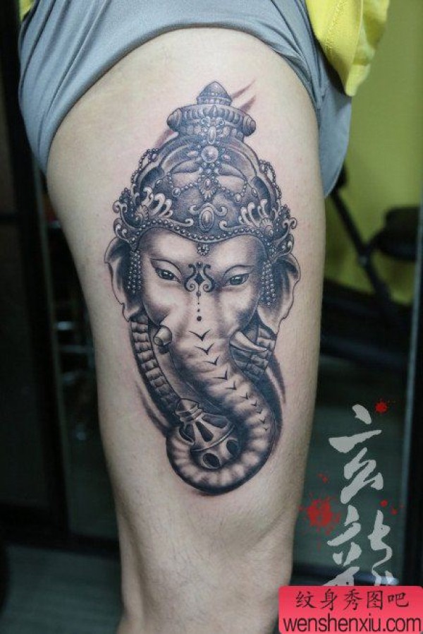 腿部时尚经典的黑白象神纹身图案