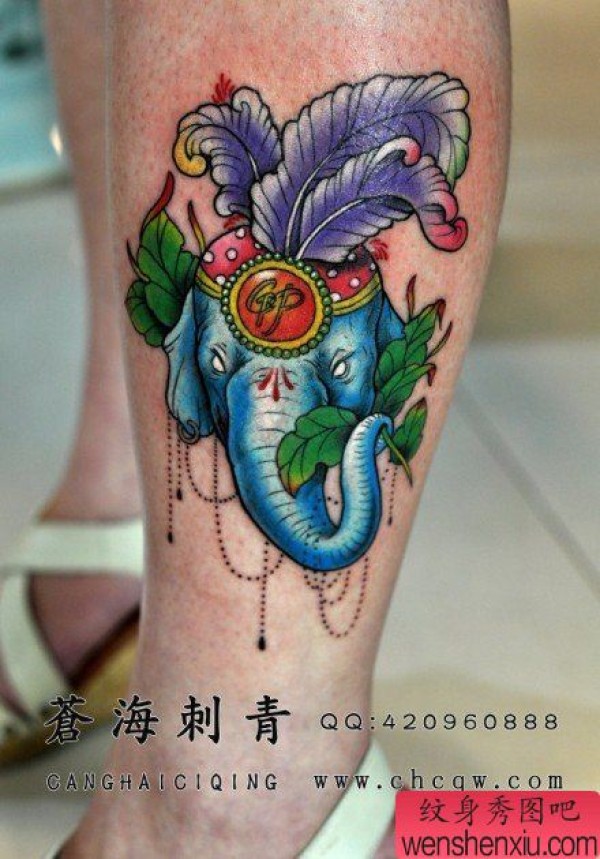 女生腿部漂亮时尚的大象纹身图案