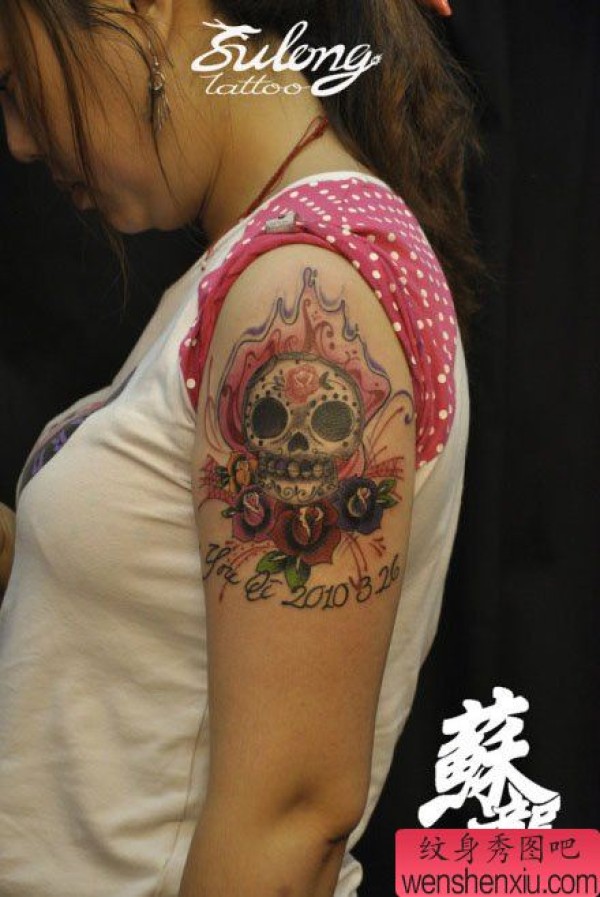 手臂漂亮精美的欧美欧美花骷髅纹身图案