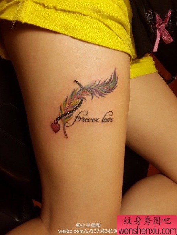 女生腿部唯美漂亮的彩色羽毛纹身图案