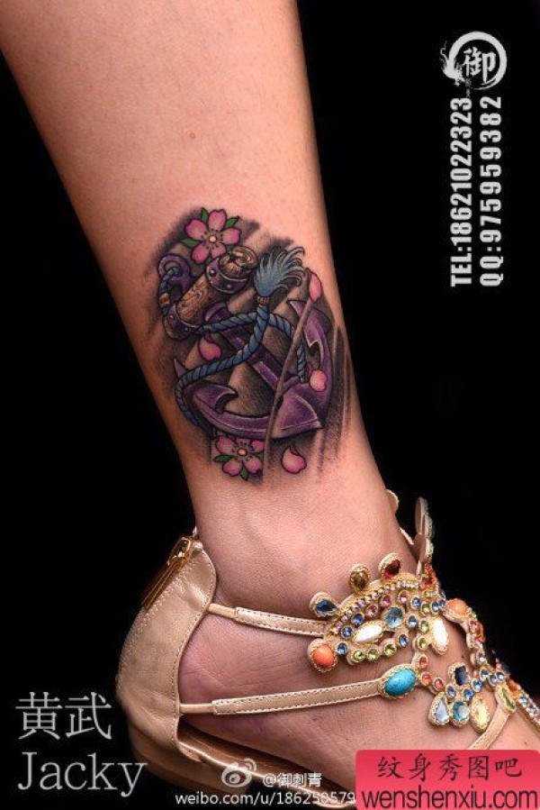 女生小腿漂亮时尚的彩色船锚纹身图案