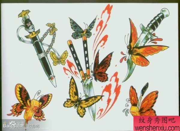 一张漂亮精美的蝴蝶与匕首纹身手稿