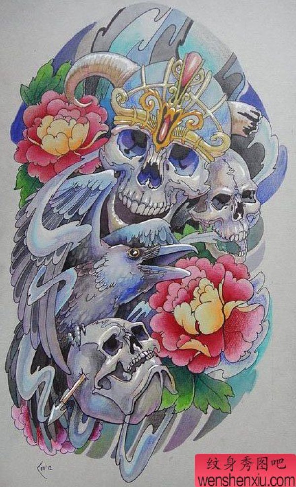 霸气超酷的骷髅与乌鸦纹身手稿