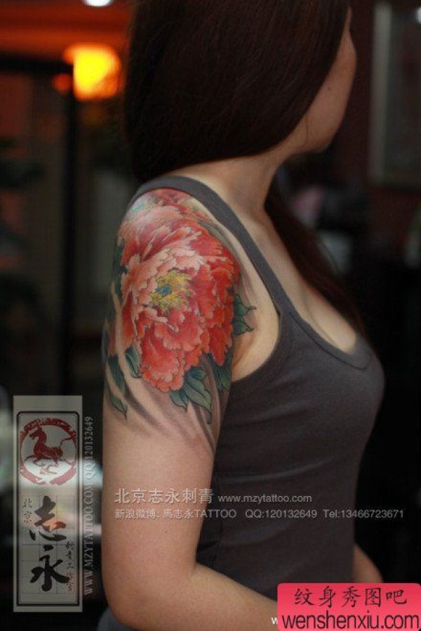 美女手臂漂亮时尚的彩色牡丹花纹身图案