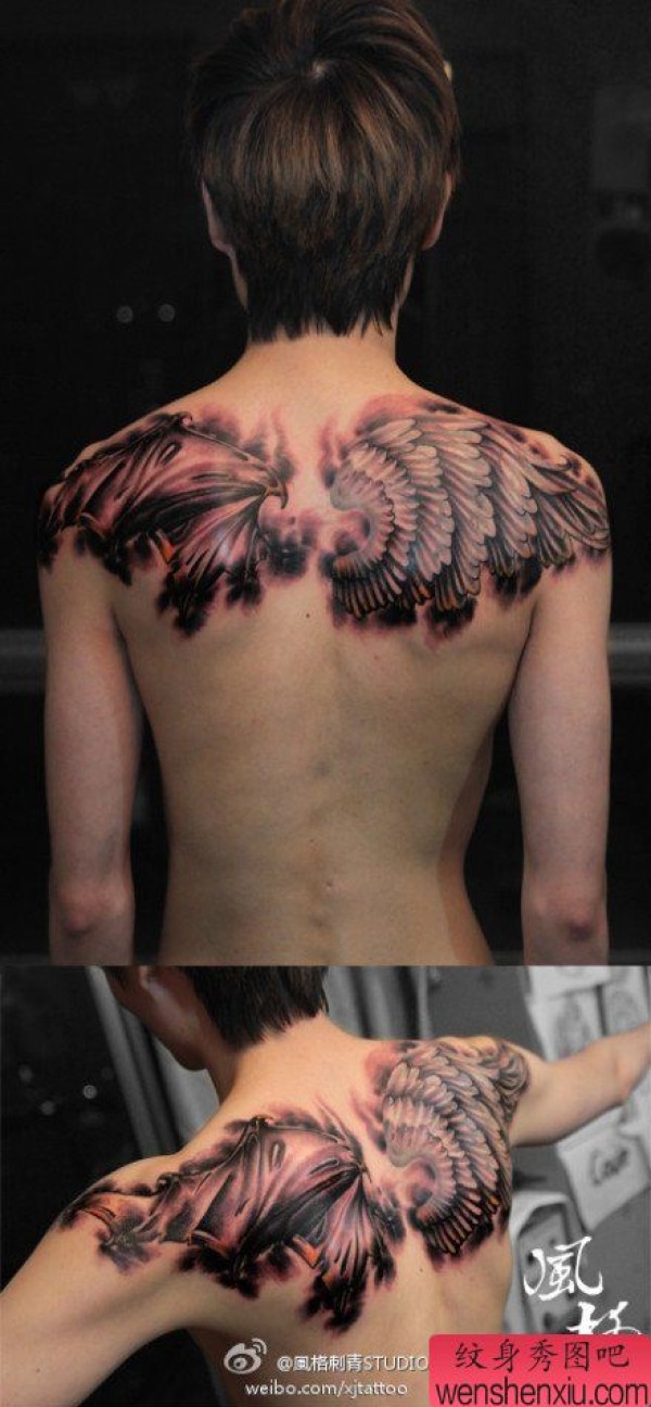 男士后背超酷的一半天使一半恶魔翅膀纹身图案