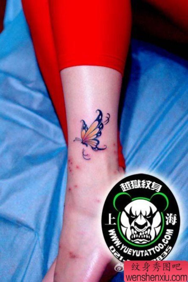 女生腿部时尚小巧的彩色蝴蝶纹身图案