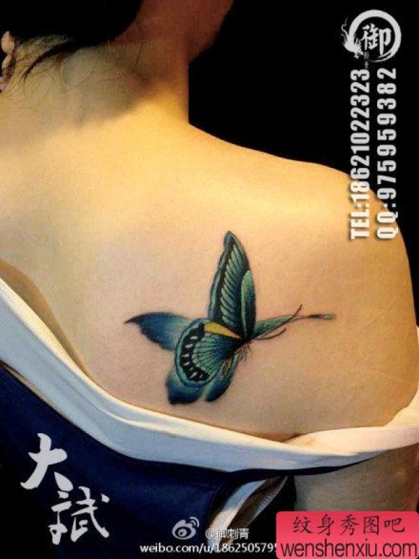 女生后肩背时尚漂亮的彩色蝴蝶纹身图案
