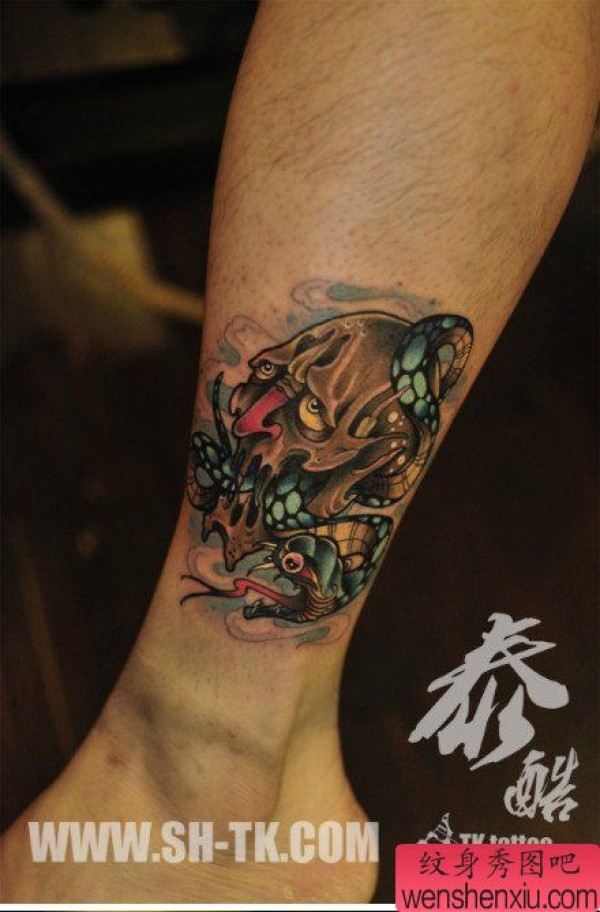 腿部经典时尚的school风格的蛇与骷髅纹身图案