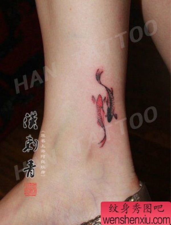 女生脚踝处小巧时尚的水墨鲤鱼纹身图案