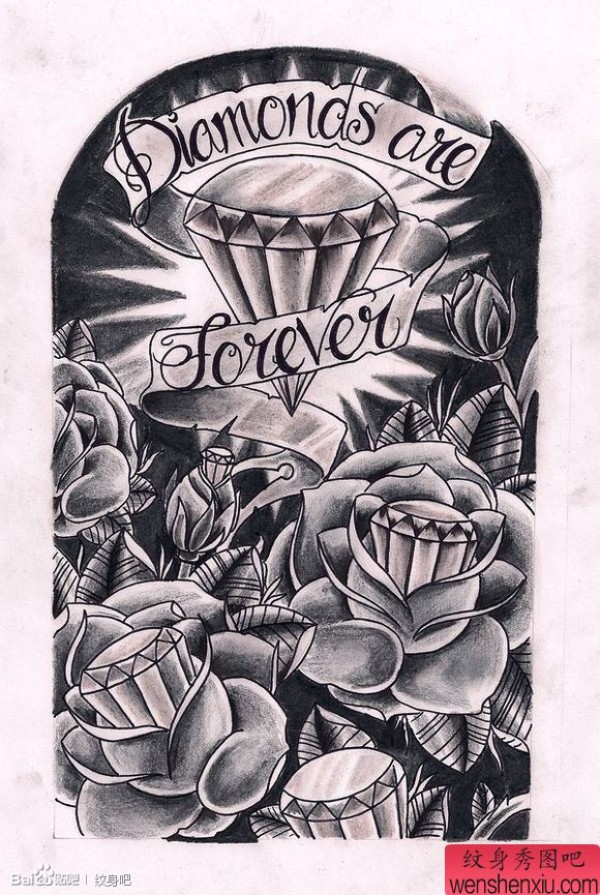 漂亮唯美的黑白玫瑰花与钻石纹身手稿