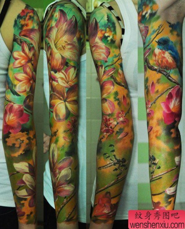 漂亮时尚的花臂百合花纹身图案