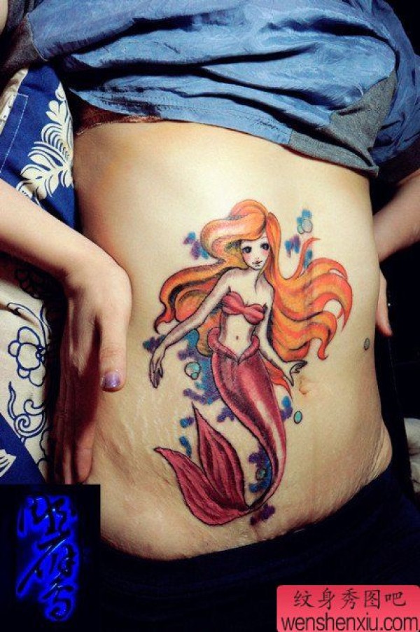 女生腹部时尚时尚的卡通美人鱼纹身图案
