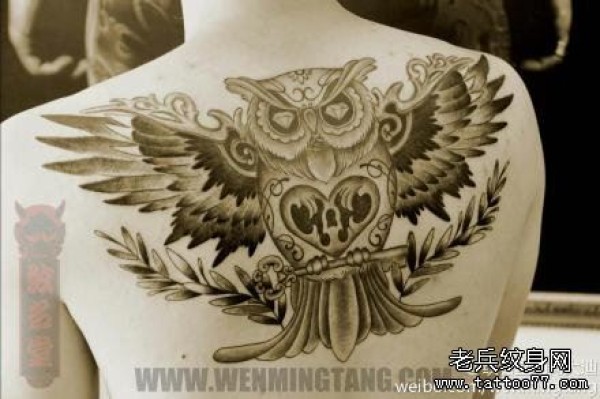 男士后背霸气超酷的黑白猫头鹰纹身图案