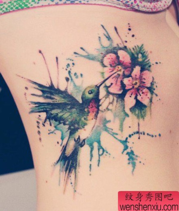 美女侧胸漂亮时尚的彩色蜂鸟纹身图案