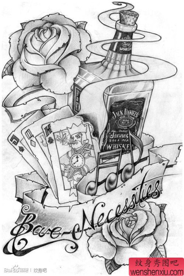 欧美风一张威士忌扑克牌玫瑰花纹身手稿