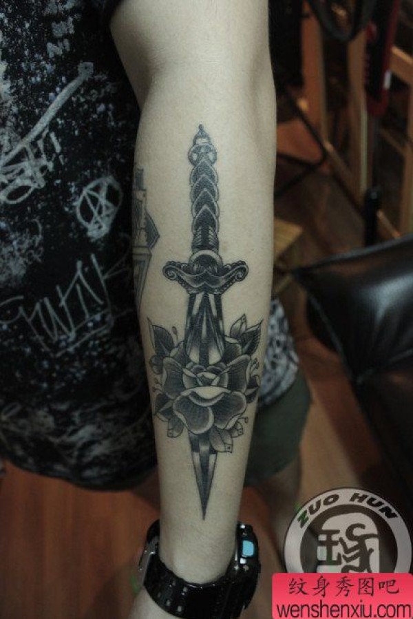 女生腿部时尚经典的黑白匕首纹身图案