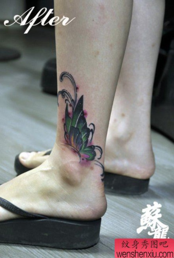 女生小腿漂亮时尚的彩色蝴蝶纹身图案