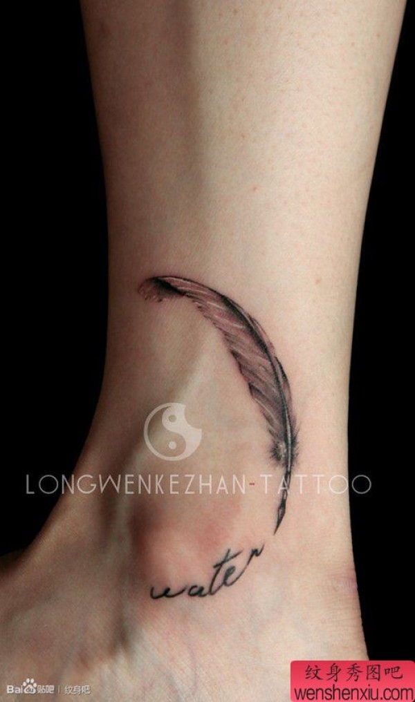 女生脚踝处纤细唯美的羽毛纹身图案