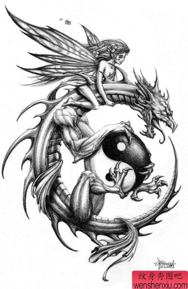 经典时尚的欧美龙与精灵纹身图案
