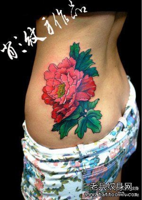 女生腰部漂亮时尚的牡丹花纹身图案