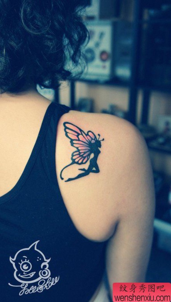 女生后肩背时尚经典的蝴蝶精灵纹身图案